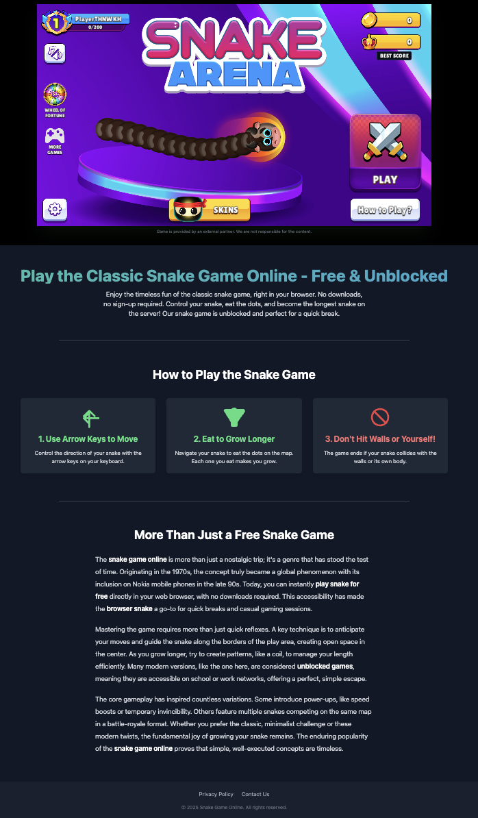 - 下方配一段简短描述:Enjoy the timeless fun of the classic snake game, right in your browser. No downloads, no sign-up required. Control your snake, eat the dots, and become the longest snake on the server! Our snake game is unblocked and perfect for a quick break.