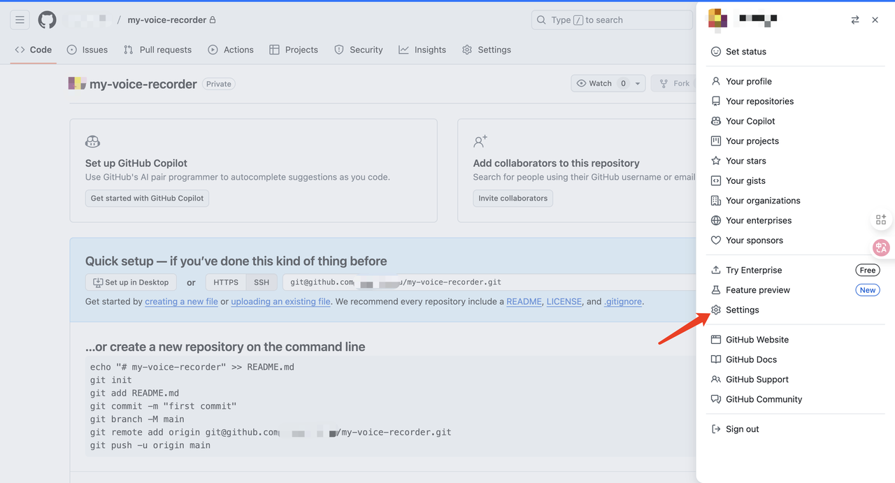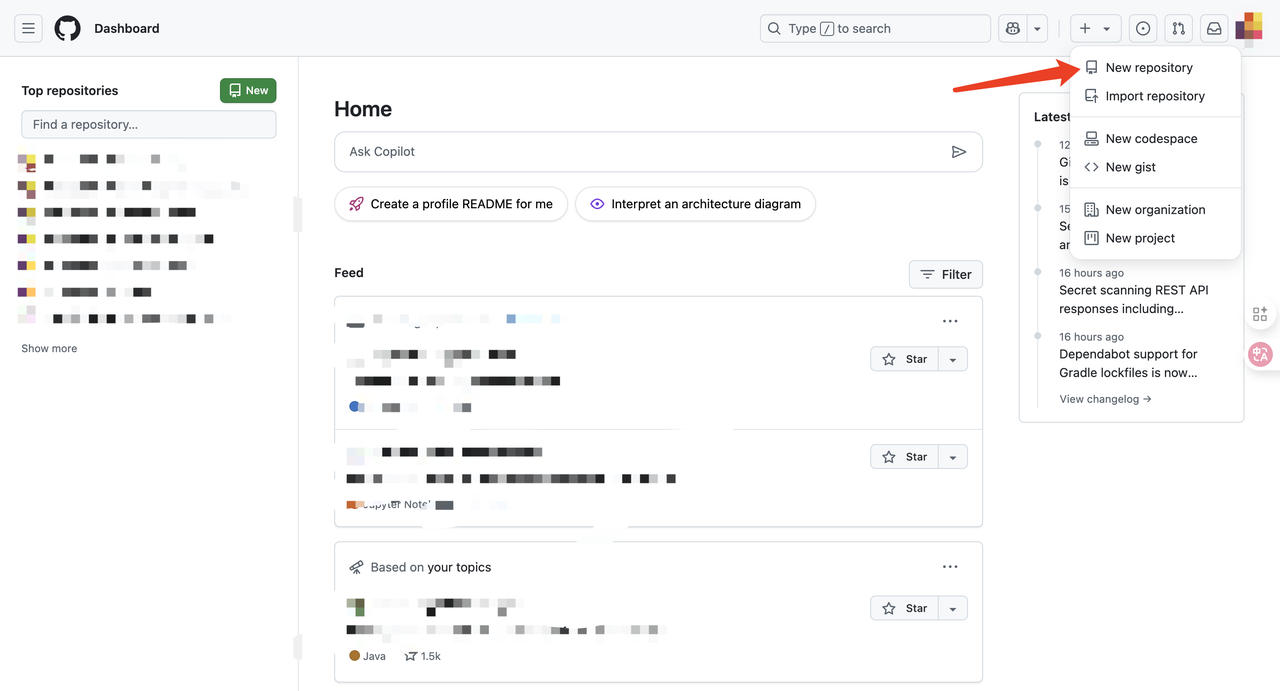 点击页面右上角的“+”号,然后选择“New repository”。