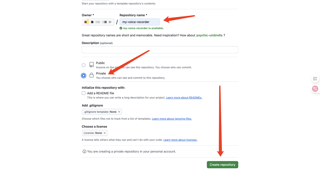 最关键的一步:选择仓库的可见性。 你会看到两个选项: