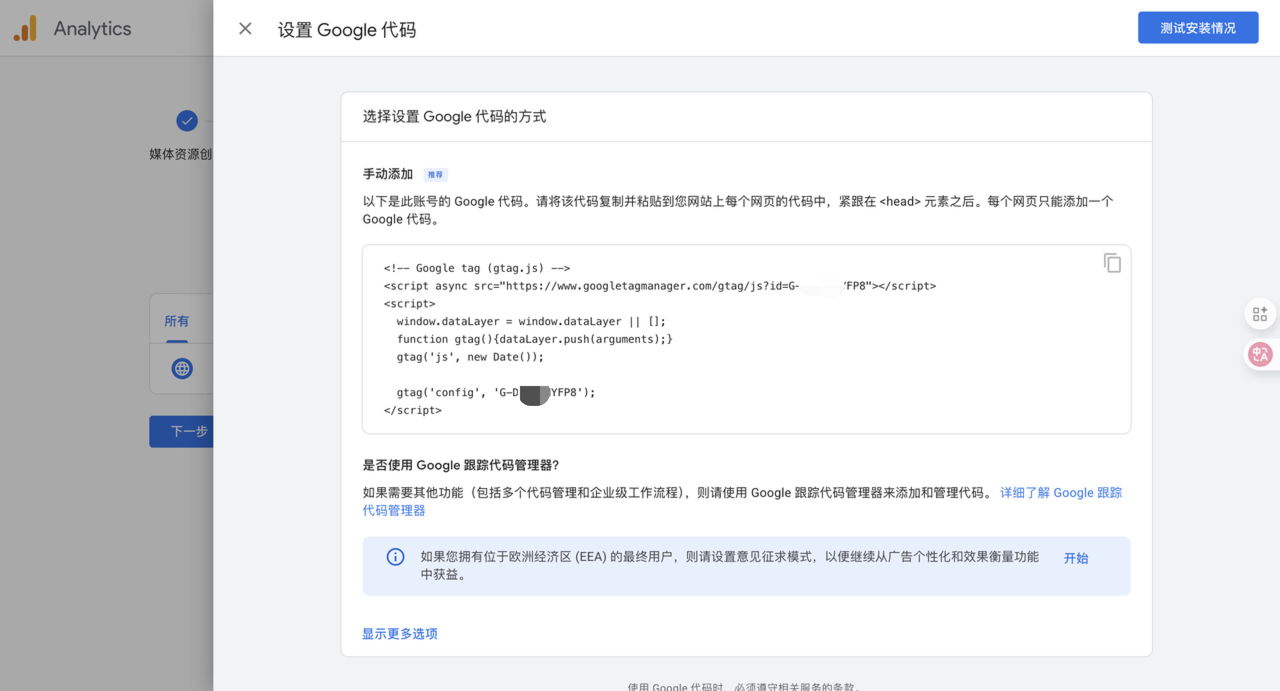 创建完数据流后,GA会为你生成一段专属的跟踪代码。这正是您在截图中看到的那段以 `` 开头的代码。