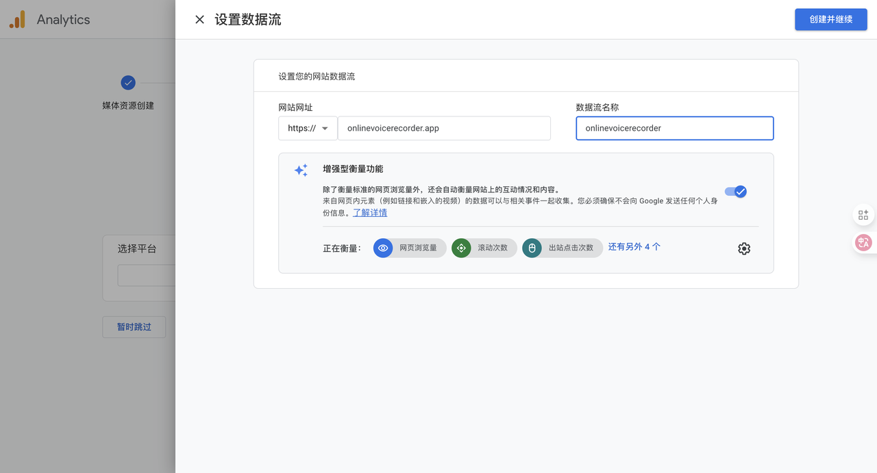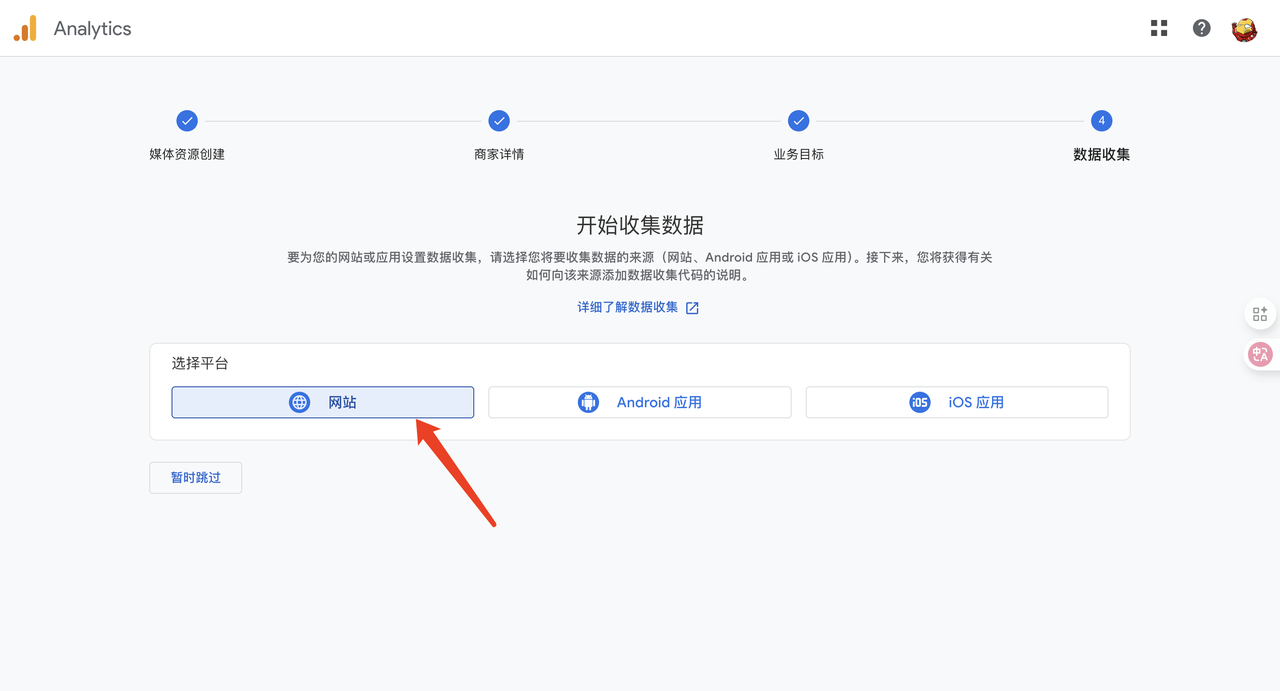 - 完成后,GA会引导你设置“数据流”(Data Stream),选择“网站”,并输入你的域名。