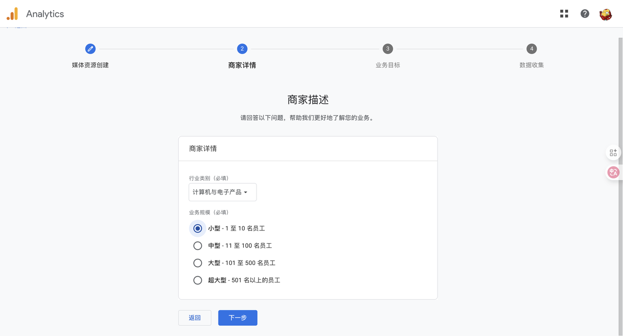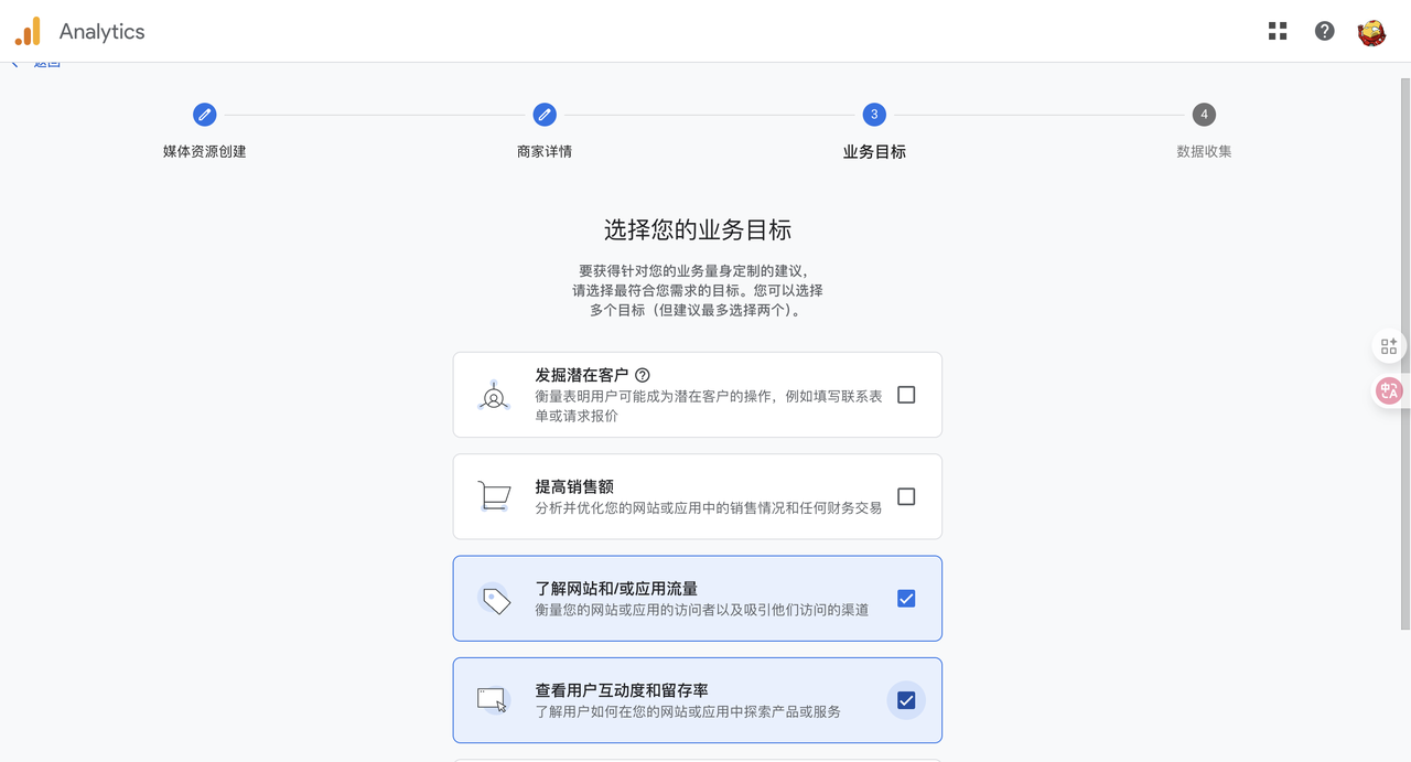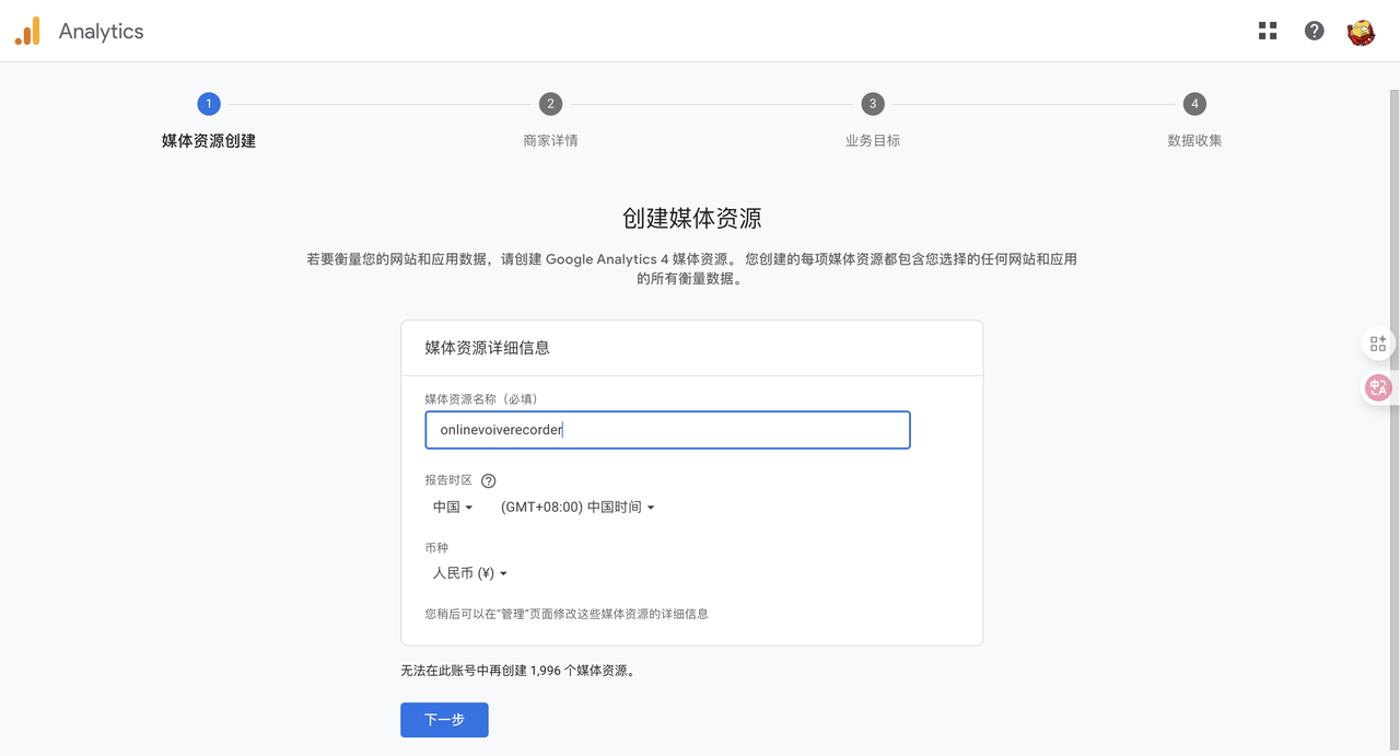 - 点击“开始衡量”,创建一个新的“媒体资源”(Property)。按照提示,输入你的网站名称、选择行业、时区等信息。