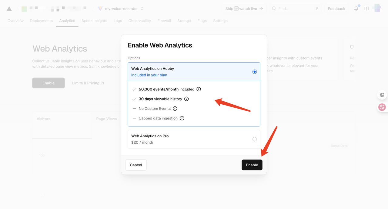 Vercel会引导你开启分析功能。根据它的提示,通常你只需要点击一个“Enable”(启用)按钮,Vercel就会自动为你的项目注入分析脚本。