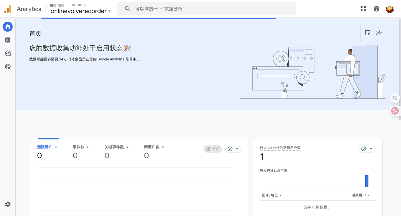 如果一切正常,你应该能在几秒钟内在“实时”报告中,看到有一个“活跃用户”,这就证明已经开始成功地为你追踪数据了。