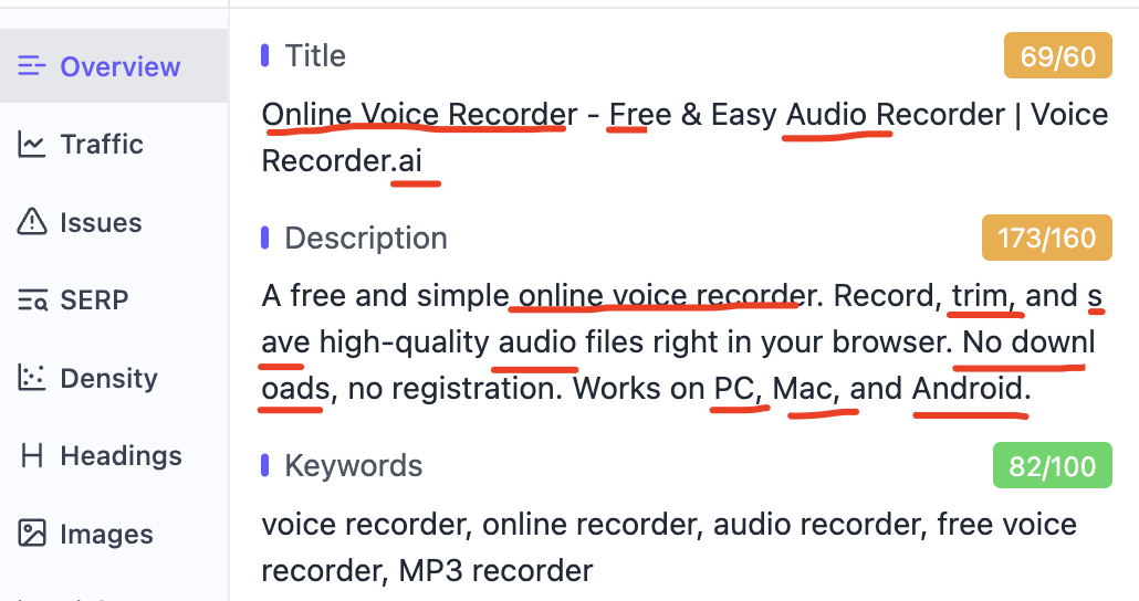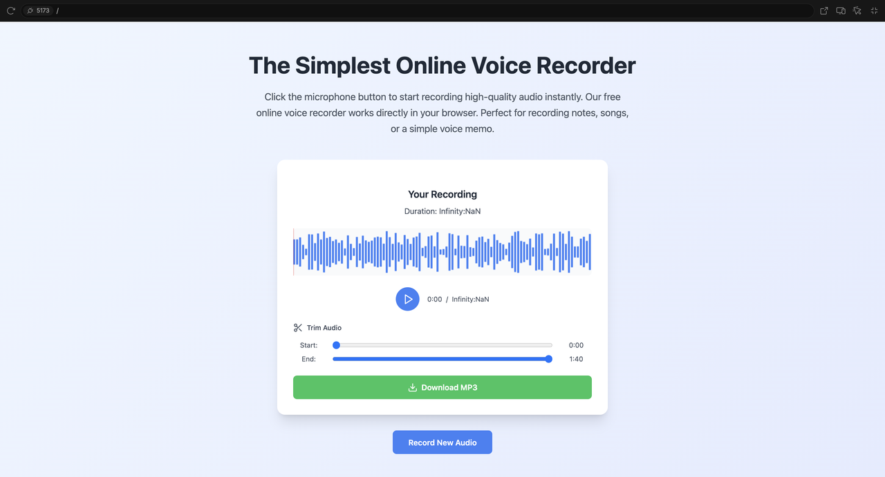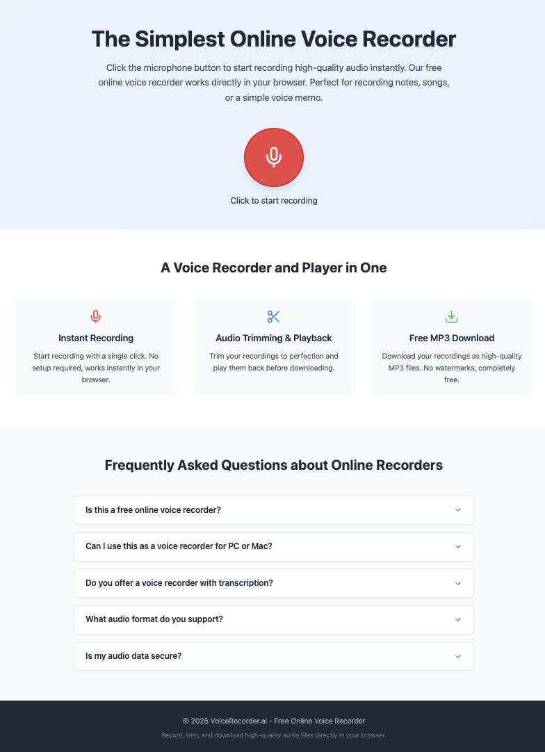 <meta name="description" content="A free and simple online voice recorder. Record, trim, and save high-quality audio files right in your browser. No downloads, no registration. Works on PC, Mac, and Android.">