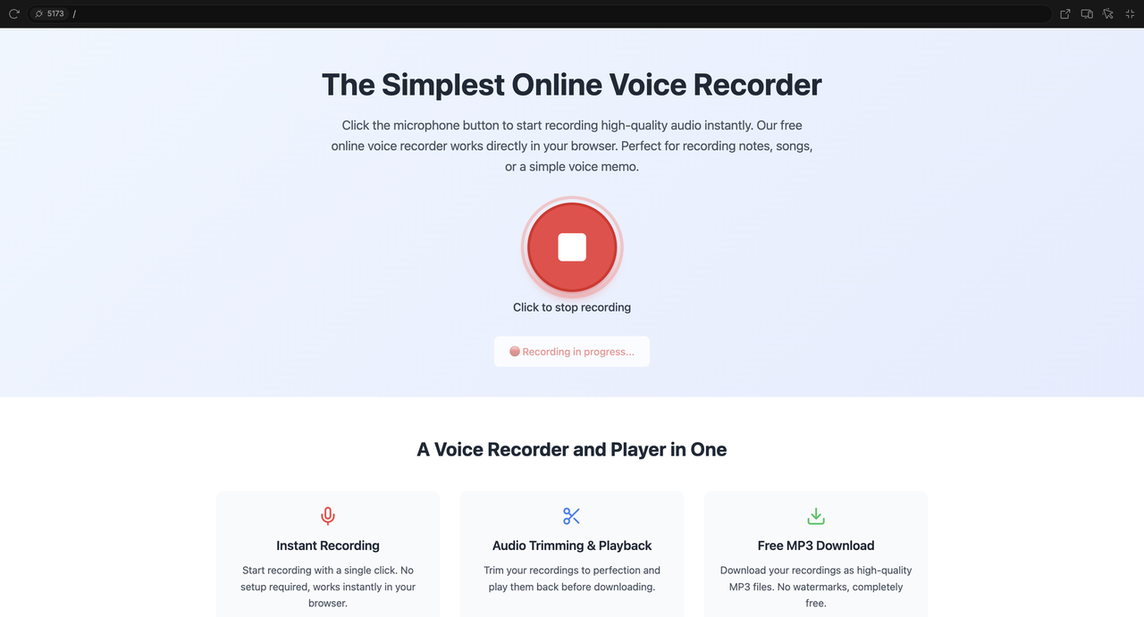 <p>Click the microphone button to start recording high-quality audio instantly. Our free online voice recorder works directly in your browser. Perfect for recording notes, songs, or a simple voice memo.</p>H2功能介绍标题: