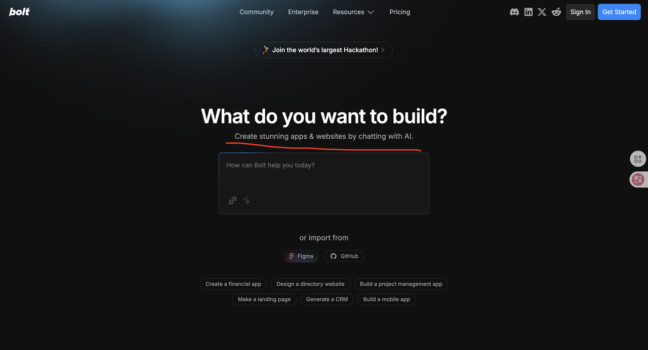 嗯,新手第一个站,根本用不到cursor,用不到claude code之类的工具,我们拿bolt.new先搞个简单的站。